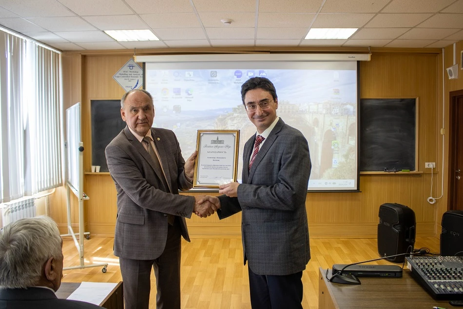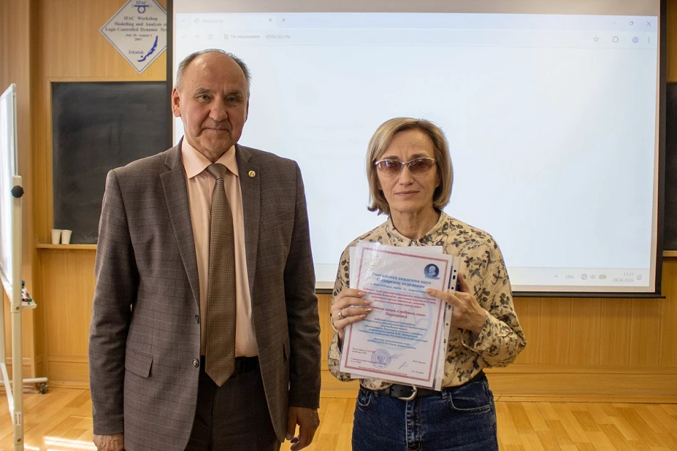 Директор ИДСТУ СО РАН академик РАН Игорь Вячеславович Бычков вручил награды сотрудникам института. Главный научный сотрудник отделения прикладных проблем математической физики и теории поля доктор физико‑математических наук Александр Леонидович Казаков удостоен Благодарности Российской академии наук за плодотворный и добросовестный труд на благо российской науки, а также за активное участие в решении задач РАН. Почетным знаком «Серебряная сигма» награждена Ольга Анатольевна Николайчук — ведущий научный сотрудник лаборатории информационно‑телекоммуникационных технологий исследования техногенной безопасности ИДСТУ СО РАН, доктор технических наук, доцент. Отмечены ее вклад в развитие информационных технологий и решение задач техногенной безопасности, многолетний добросовестный труд, плодотворная научная деятельность и подготовка высококвалифицированных научных кадров.