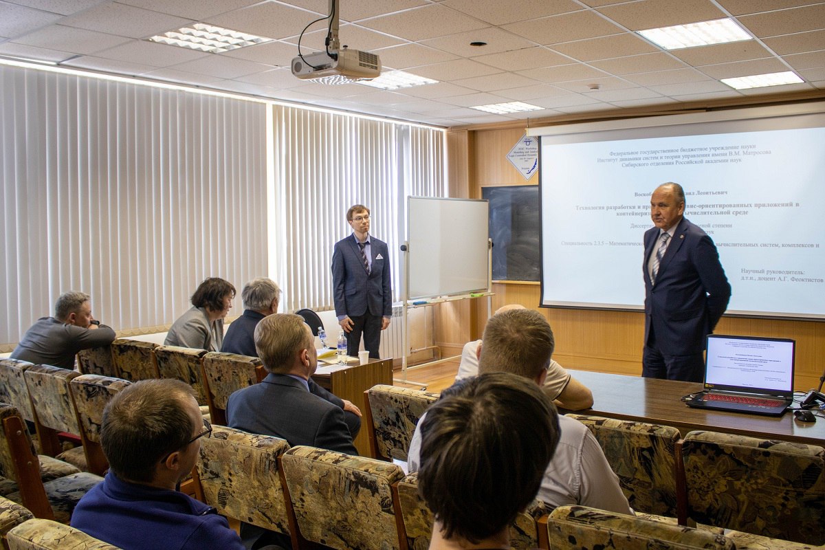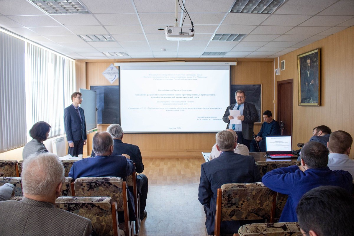 В Институте динамики систем и теории управления имени В. М. Матросова СО РАН 3 марта прошла защита кандидатской диссертации младшего научного сотрудника лаборатории комплексных информационных систем Михаила Леонтьевича Воскобойникова. Тема работы — «Технология разработки и применения сервис‑ориентированных приложений в контейнеризированной вычислительной среде». Исследование выполнено по специальности 2.3.5 «Математическое и программное обеспечение вычислительных систем, комплексов и компьютерных сетей». Работа выполнялась под научным руководством заместителя директора по научной работе ИДСТУ СО РАН доктора технических наук Александра Геннадьевича Феоктистова.