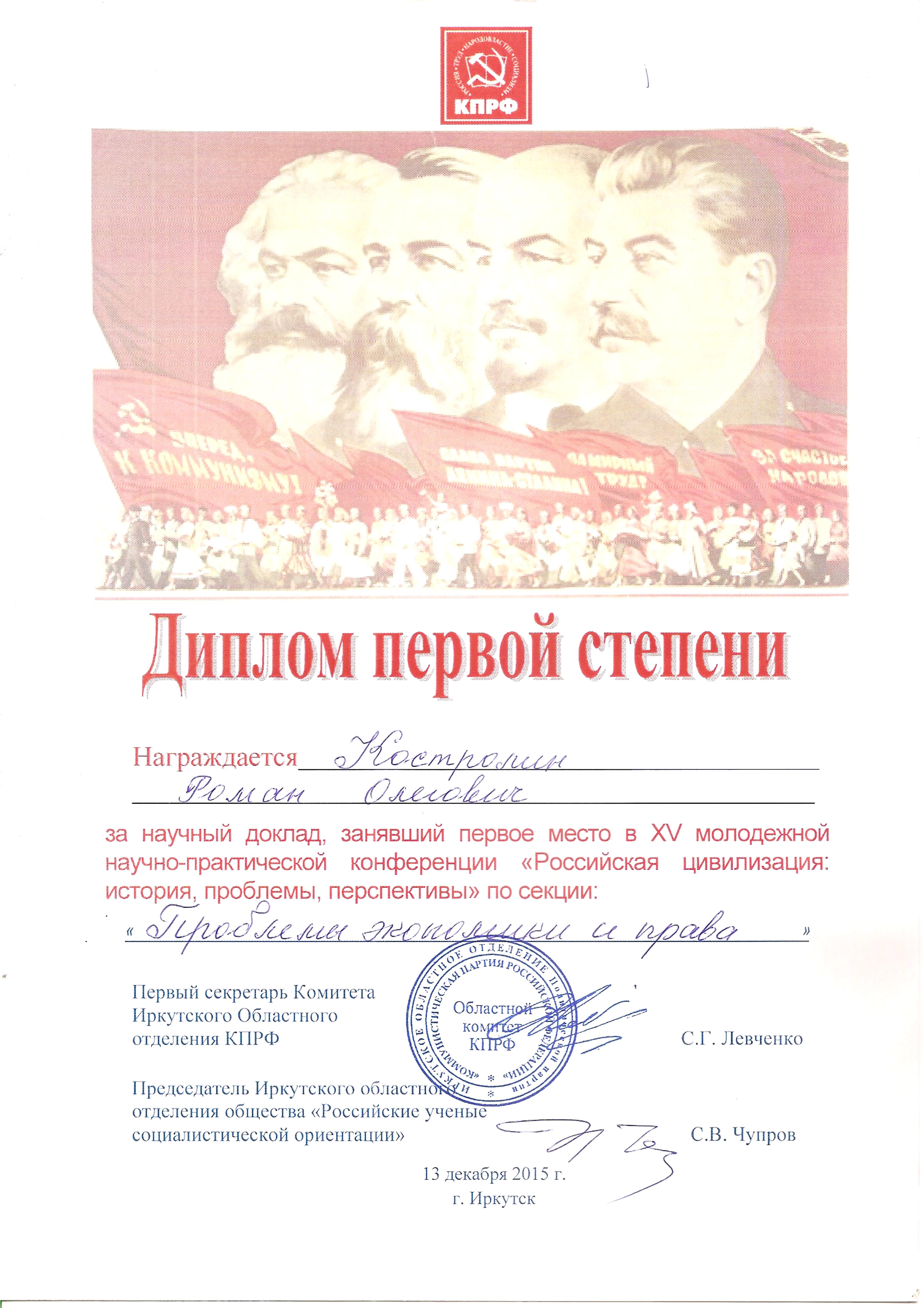 ![]() | Диплом первой степени за научный доклад, занявший первое место в XV молодежной научно-практической конференции «Российская цивилизация: история, проблемы, перспективы», г. Иркутск, 2015 г. |