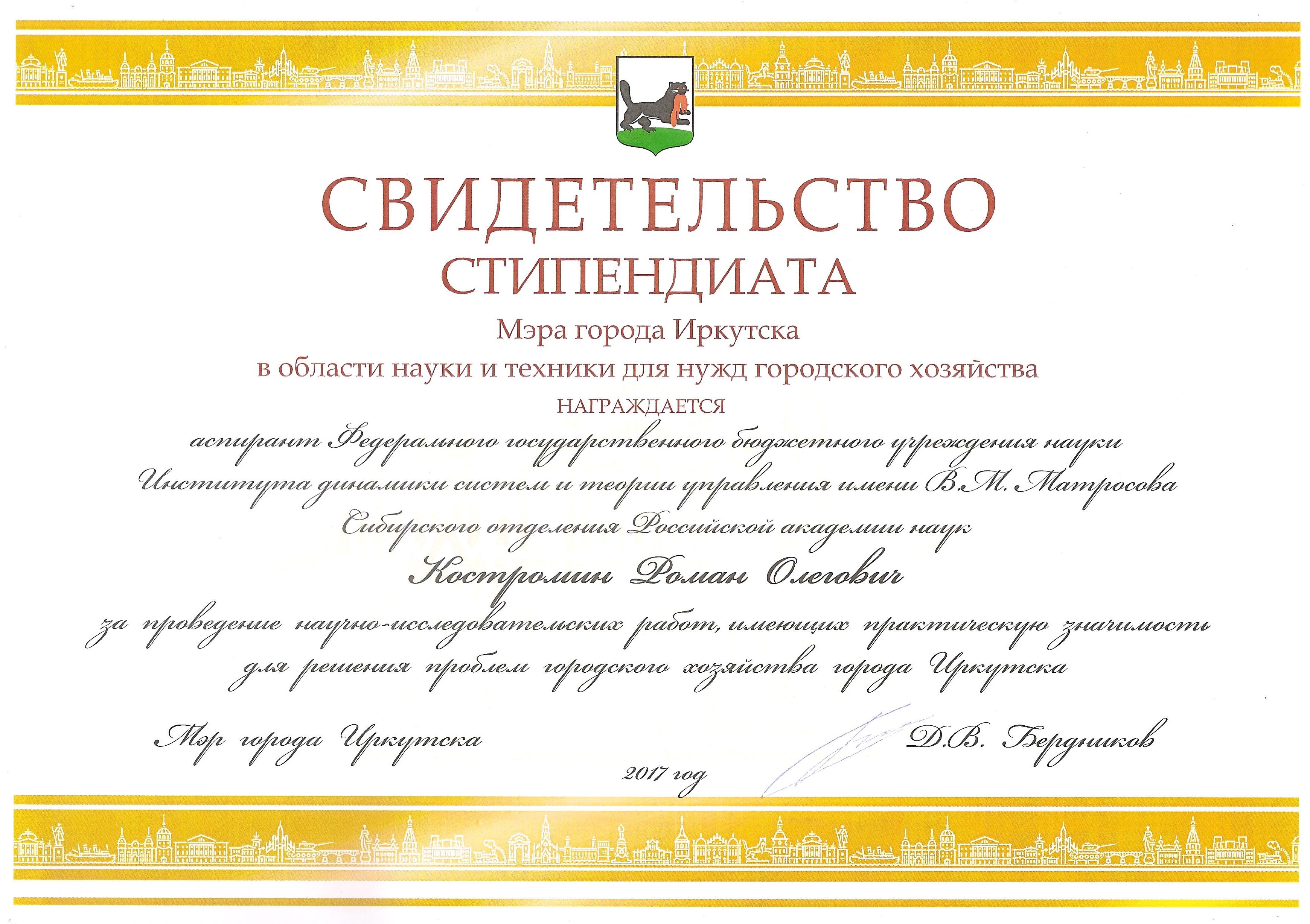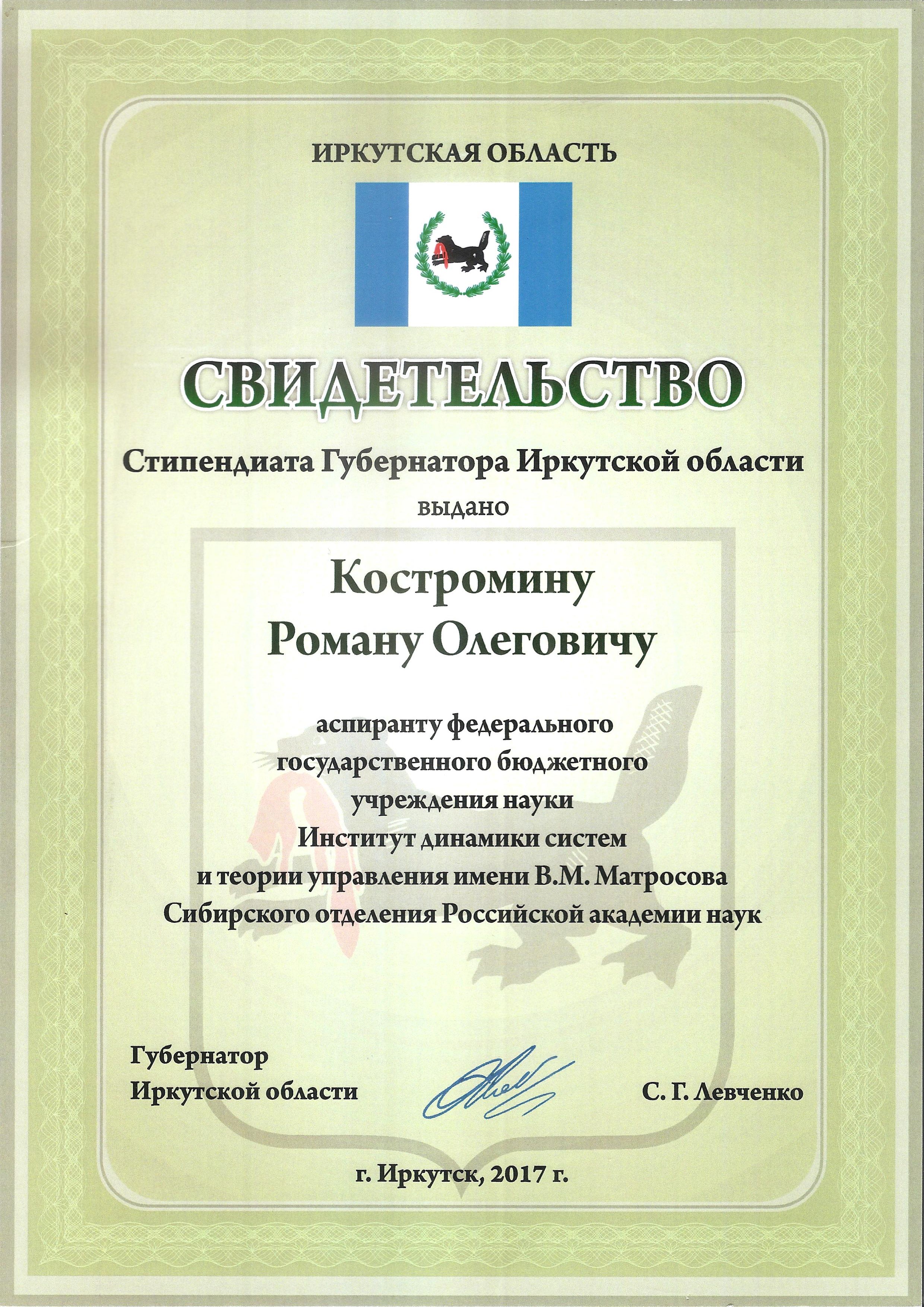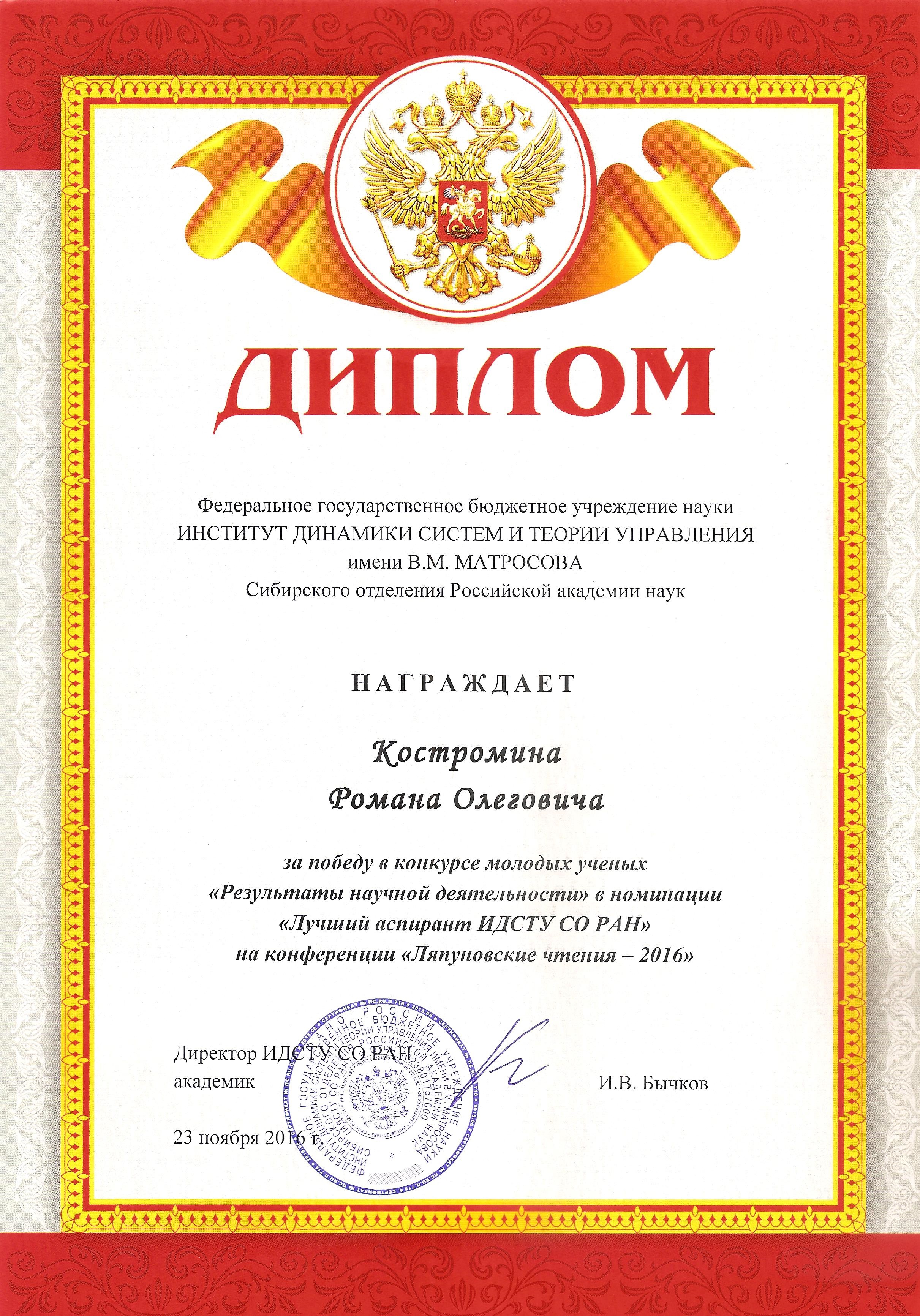 ![]() | Диплом за победу в конкурсе молодых ученых в номинации «Лучший аспирант ИДСТУ СО РАН» на конференции «Ляпуновские чтения – 2016», г. Иркутск, 2016 г. |