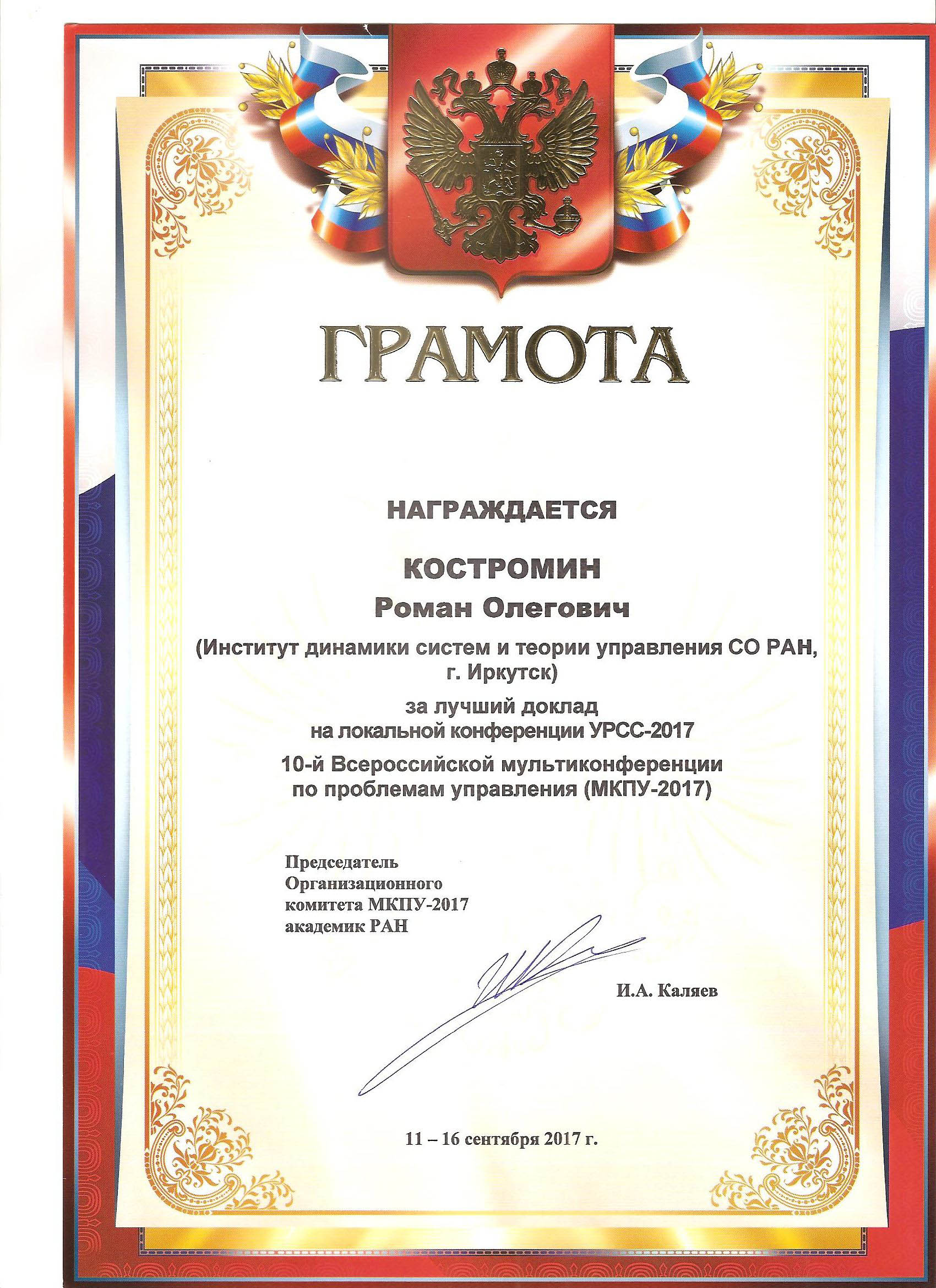 ![]() | Грамота за лучший доклад на локальной конференции УРСС-2017 10-й Всероссийской мультиконференции по проблемам управления (МКПУ-2017), с. Дивноморское, 2017 г. |
