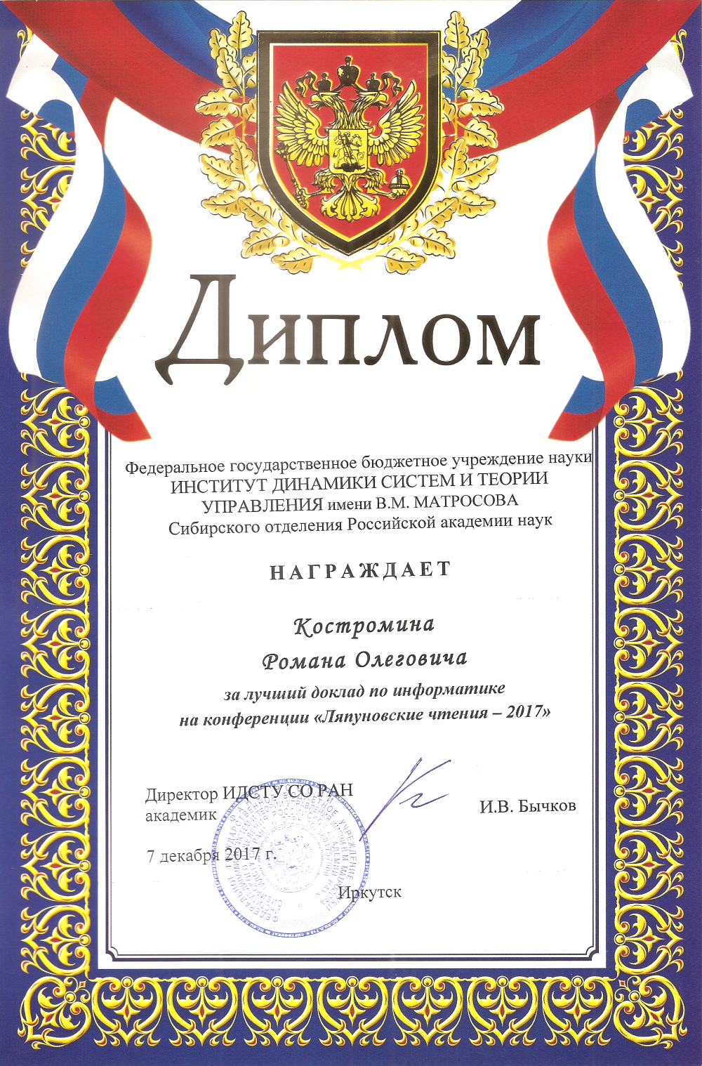 ![]() | Диплом за лучший доклад на по информатике на конференции «Ляпуновские чтения – 2017», г. Иркутск, 2017 г. |